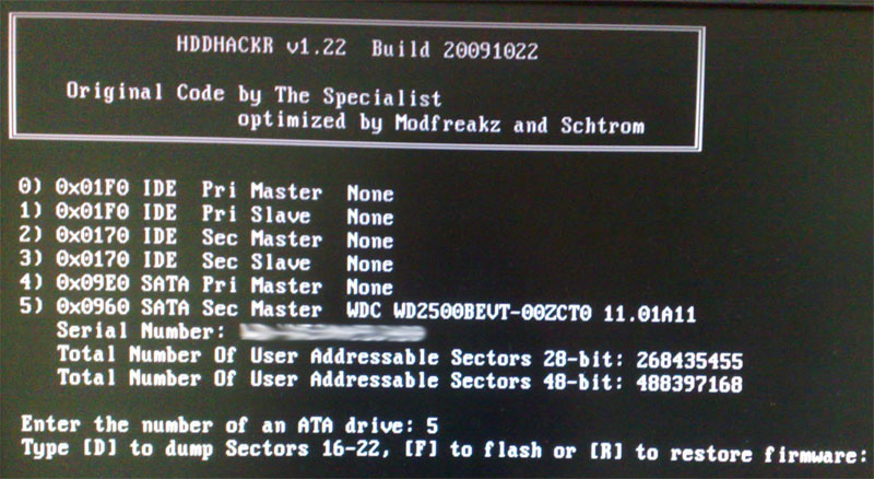 hddhackr перечислит все диски в вашей системе, в моем случае диск, который я хочу сделать, номер 5.