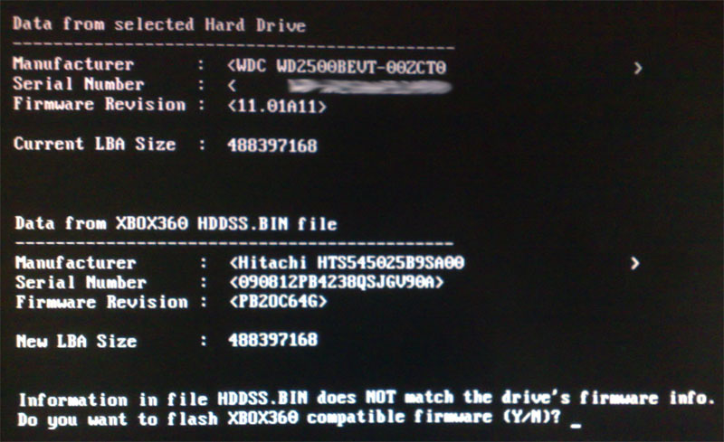Вы получите сообщение о том, что информация в файле HDDSS.BIN не соответствует информации о прошивке накопителя. Хотите прошить Xbox 360 совместимую прошивку.